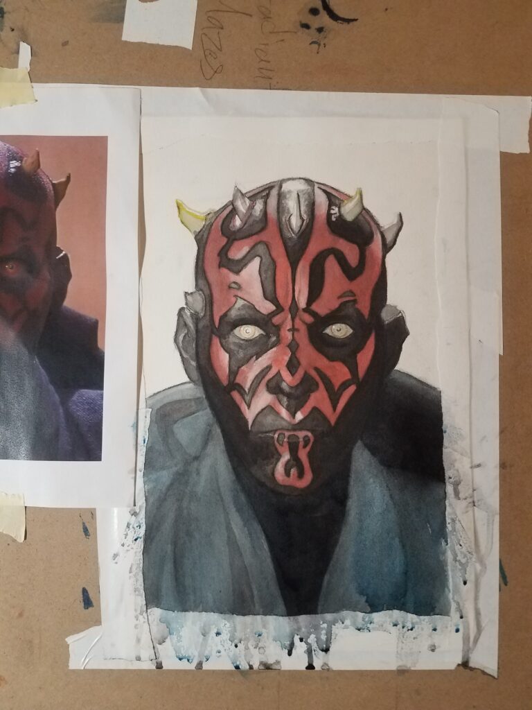 I am not much of Star Wars fan. There may be robots and intergalactic travel, but I think its more so fantasy that happens to be in space with a nod to technology. And even as fantasy, its not particularly good. The originals are okay, they still hold up. But there is way more low quality Star Wars media than there is content that is good and enjoyable. But, yeah, made this for a friend. You can tell I only cared so much about this piece because I don’t have a current photo and I even handed it off incomplete. In the end, there was more definition in the eyes and maybe horns? I don’t care. It was a fun study on symmetry but not exactly challenging – I only used four different colors, maybe, and there was next to no mixing. Great work for a beginner, but I have failed to impress myself. Not to mention Darth Maul is one of the most one-dimensional characters in the Star Wars universe who only got somewhat fleshed-out posthumously. And, to be clear, I thought Star Wars lackluster even before Disney bought Lucas Arts.